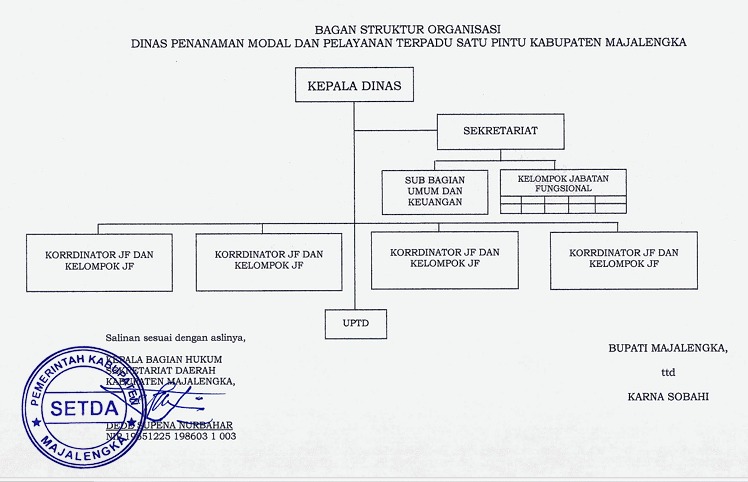 Berdasarkan Peraturan Bupati Majalengka Nomor 69 Tahun 2021 tentang Kedudukan, Susunan Organisasi, Tugas Pokok Dinas Daerah di Lingkungan Pemerintah Kabupaten Majalengka, Dinas Penanaman Modal dan Pelayanan Terpadu Satu Pintu Kabupaten Majalengka terdiri dari : 1. Kepala Dinas 2. Sekretariat, membawahi : a. Sub Bagian Umum dan Keuangan b. Kelompok Jabatan Fugsional 3. Koordinator Jabatan Fungsional dan Kelompok Jabatan Fungsional 4. UPTD